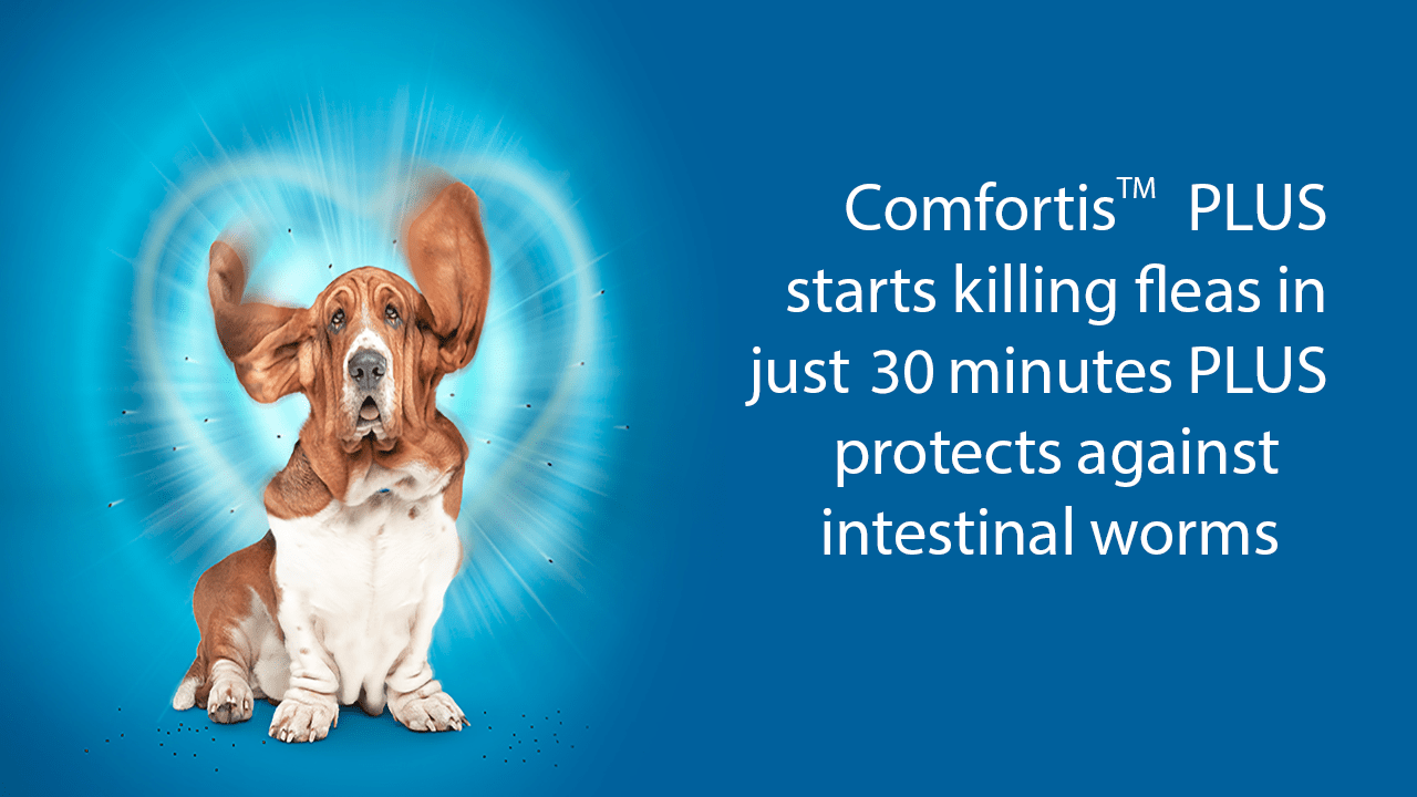 Comfortis PLUS provides parasite protection for your dog against fleas and intestinal worms (excluding tapeworm). The treatment is suitable for dogs with flea allergy dermatitis and will provide fast-acting flea protection for the entire month. As a tablet, there are no restrictions with regards to your dog swimming or being washed, and it won't rub off on your furniture.